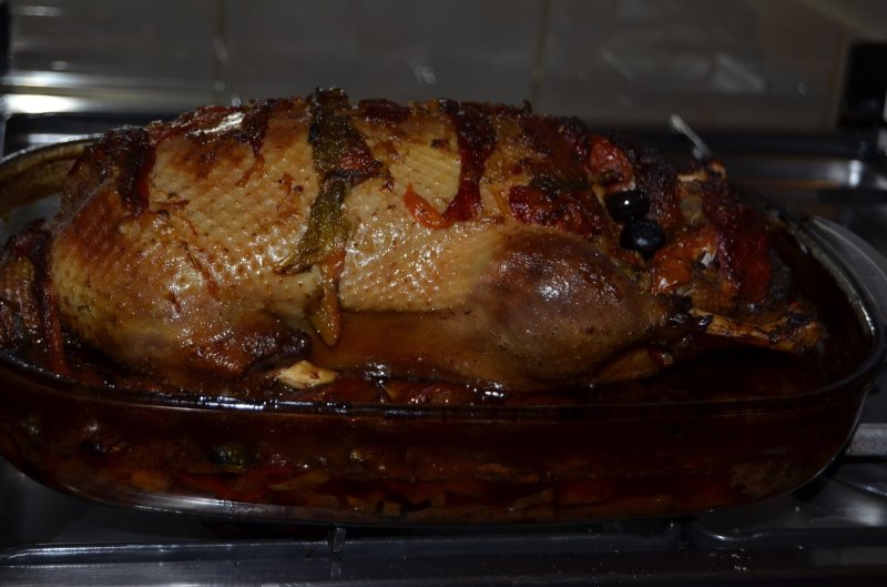 Se ia o bucata de grasime de rata si se pune in tigaie la prajit si cand se topeste, se adauga ceapa tocata, carnatul afumat si se lasa sa se prajeasca, pana cand ceapa se patrunde, apoi se adauga sare, cardamom, cimbru, ardeii capia taiati in felii si se mai lasa pret de cateva minute sa se patrunda si sa se intrepatrunda gusturile, apoi se umple rata cu carnati; ce ramane se adauga peste rata si pe langa rata ce a fost pusa in tava, se mai adauga si ceva masline, vin, se pune capac si se da tava la cuptor, pana cand scade vinul, apoi se ia capacul si se mai lasa pret de cateva minute sa se rumeneasca si se opreste focul.