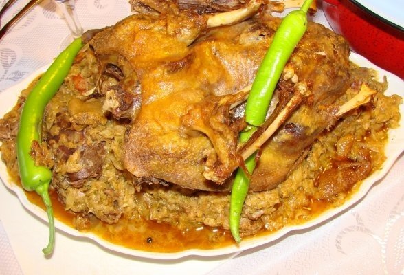 7.Cand este gata cea de-a doua rata, se asaza pe un platou peste varza si se poate orna cu ardei iute.