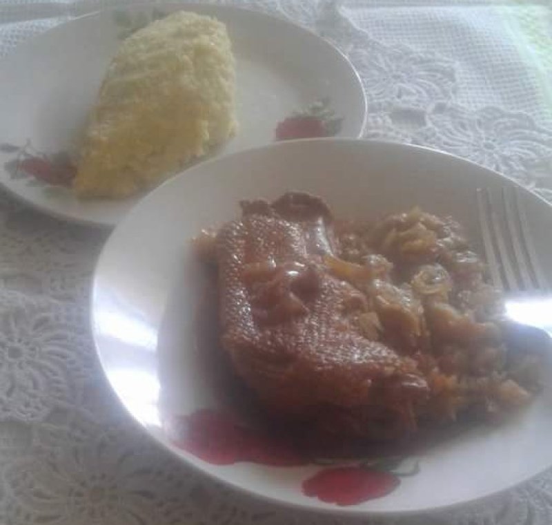 Spălam bucățile de rata, le punem in oala cu apa, sare si cuișoare si fierbem aproape o ora, luând spuma din când in când. Tăiem julien subţire varza alba si o frecam cu sare. Tocam mărunt ceapa si morcovii. Intr-o cratiță, prăjim ceapa, morcovii, pana se rumenesc, apoi adăugam vinul alb si il lăsăm sa se evapore. Punem varza in cratiță si amestecam. Acoperim varza cu un capac, in așa fel încât sa nu mai fie nevoie sa adăugam apa, altfel daca observam ca nu are destul lichid cat sa fiarbă, punem un pahar de apa peste varza. Imediat ce varza este aproape gata, scoatem carnea din oala in care a fiert, punem varza si carnea intr-un vas de cuptor mai mare, de preferat, acoperim cu capac sau folie de aluminiu. Preîncălzim cuptorul la 200 de grade C si coacem pentru aproape 45 de minute, acoperit. Apoi luam capacul si mai lăsăm 15-20 de minute. Servim cu mămăliguța.