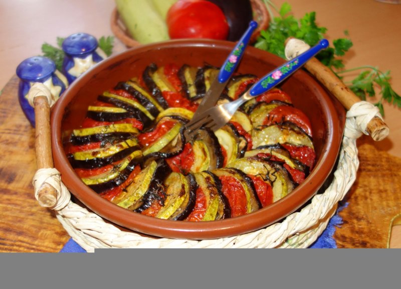 Se spala, se usuca si se taie rondele de aceeasi grosime vinetele, dovleceii si 4 rosii. Se curata usturoiul si se taie feliute subtiri.