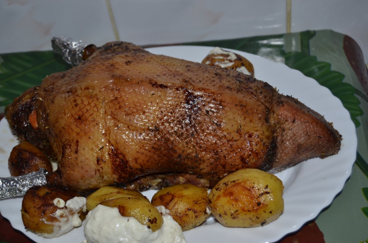 Se umplu ratele cu felii de lamaie, portocala, bucati de morcovi, catei de usturoi si se pun pe gratarul de la aragaz. Sub gratar se pune tava plina cu apa si se da drumul la cuptor la foc potrivit. Din cand in cand se mai adauga apa daca este nevoie, asta pana cand ratele se vor rumeni frumos. Cand apa se va evapora si va ramane doar grasimea de la rata se vor pune cartofii si se vor lasa pret de 30 minute pana cand se vor rumeni. Se va opri focul si se va pregati un mujdei de unsturoi din catei de usturoi, sare si smantana.