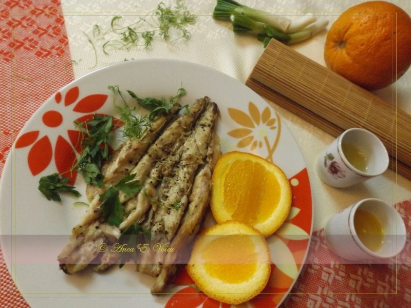 Se serveste cu lamaie si portocala, pe care le puteti taia felii sau puteti sa le stoarceti, cum am facut si eu. Portocala ii da o dulceata si o aroma interesanta si placuta. Folositi si cateva fire de marar si patrunjel, sunt nu numai decorative, ci si gustoase si dau un gust racoritor pestelui.