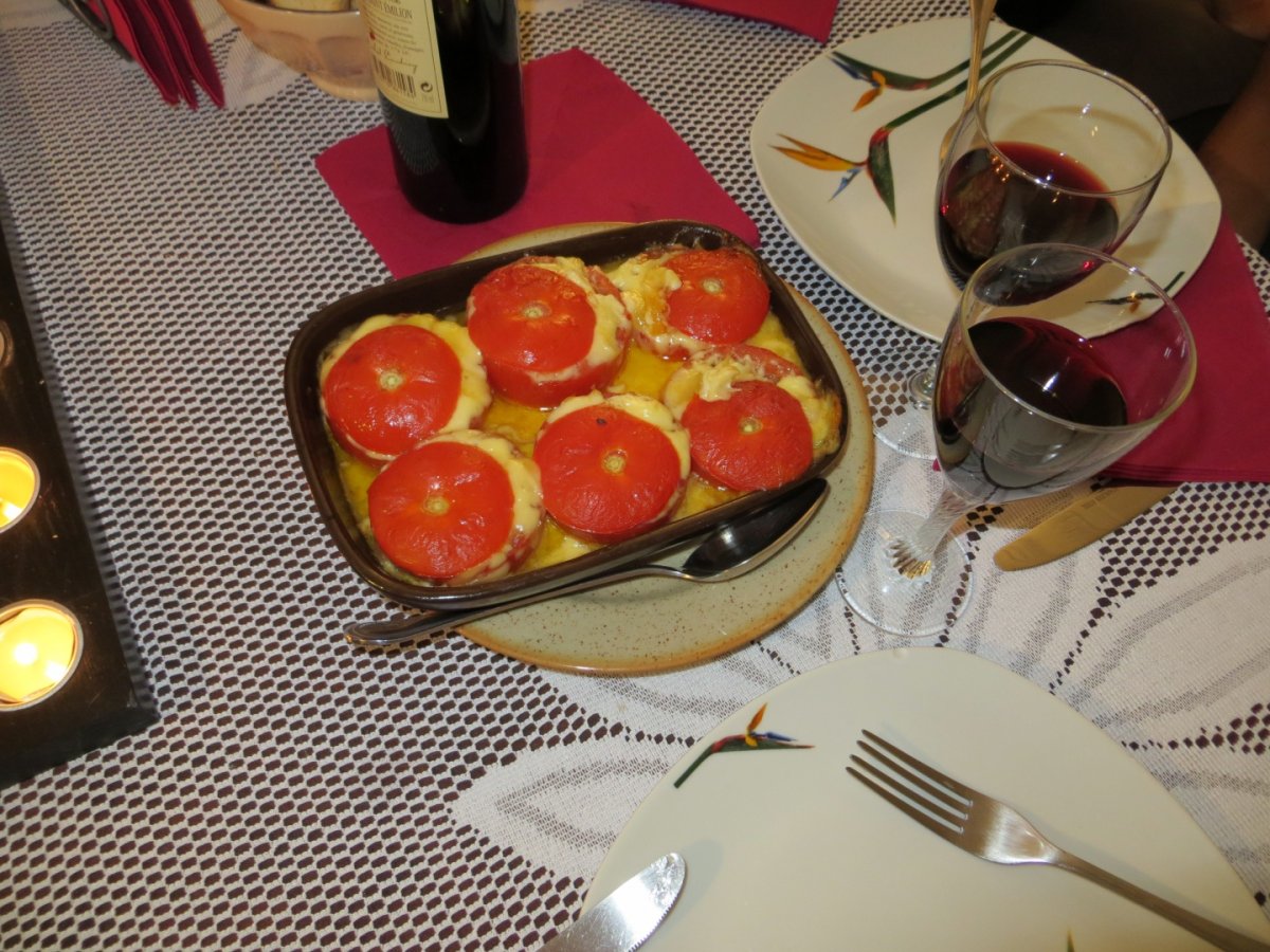 Spălăm roșiile, taiem pălăria și cu ajutorul unei linguri scoatem atent pulpa și semințele din interior așezându-le într-un vas termorezistent. Spălăm ciupercile (eu folosesc champignon obișnuit) și le tăiem felii. La fel procedăm și cu ceapa, după care le călim împreună pe tigaie în 2 linguri de ulei. Acum umplem roșiile pe jumătate (sau 3/4) cu această umplutură (tapetând puțin în interior) iar deasupra așezăm compact cașcavalul tăiat cuburi de 1 cm. Acoperim roșiile cu pălăriile inițial tăiate și punem la cuptor pentru 30 minute la foc mediu, până roșiile devin moi, iar cașcavalul complet topit. Eu obișnuiesc să acoper tava cu o folie de aluminiu ca roșiile să fie mai suculente și fragede.