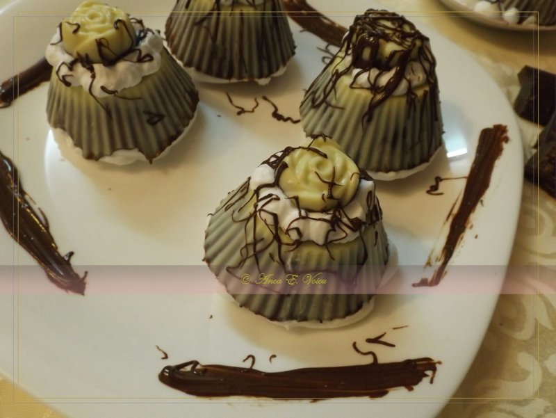 Se intorc rochitele si se asaza pe un platou, se orneaza iar cu frisca, se pune fiecareia in varf cate o bomboana, iar ciocolata ramasa in vas se presara peste ele.