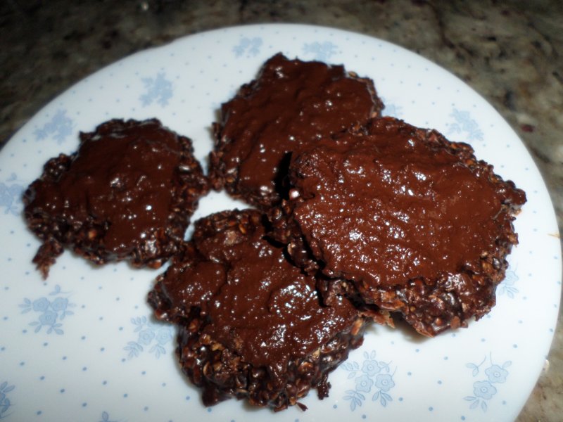 Pe o plansa tapetata cu hartie de copt punem cu 2linguri gramajoare din compozitie formandule cat mai rotunde caci se intaresc repede. Le lasam cateva minute pe hartie-topim intr-e timp ciocolata cu 1 lingura de ulei la ben-marie si ungem fursecurile cu putina ciocolata dupa dorinta.Sant foarte gustose si se pot mentine cateva zile la frigider.