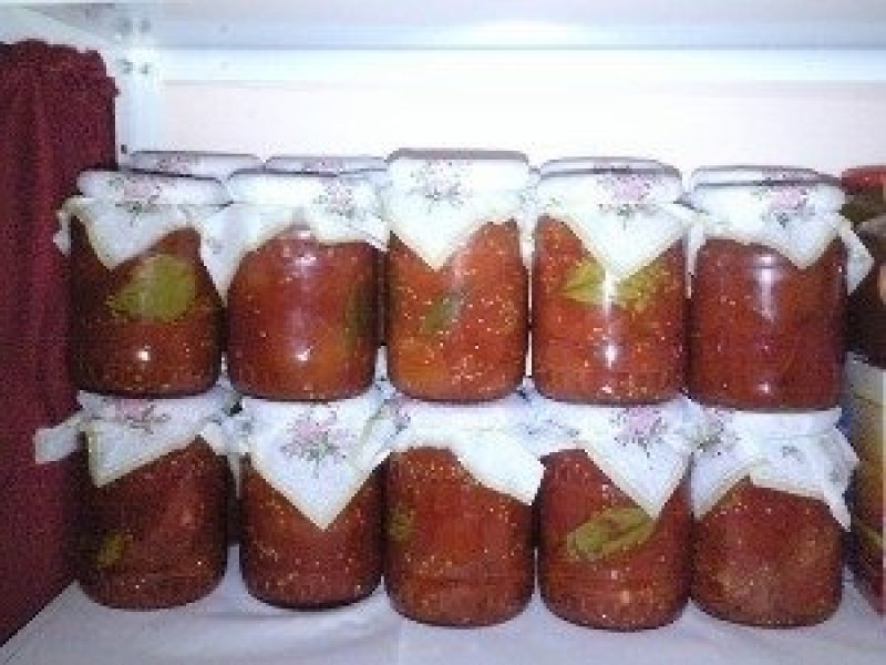 Cand borcanele sunt pline , se inchid cu capace etans apoi se sterilizeaza in cuptor la foc mic 40 minute . Se scot si se pun in paturi , tinandu-se acolo pana la racirea completa .