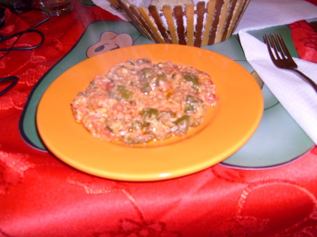 speli si sterge legumele.ardeii ii cureti de seminte si ii tai bucati.intro tigaie incingi niste ulei si prajesti ardeii putin dupa care pui rosiile taiate bucati pui capacul si lasi sa fiarba pana ce scade sucul lasat de rosii.pui bucatile de branza si mai fierbi cam2minute dupa care bati cele2oua cu putina sare si le adaugi peste rosii amesteci si mai lasi 2 minute pe foc.mancarica e buna atat calda cat si rece