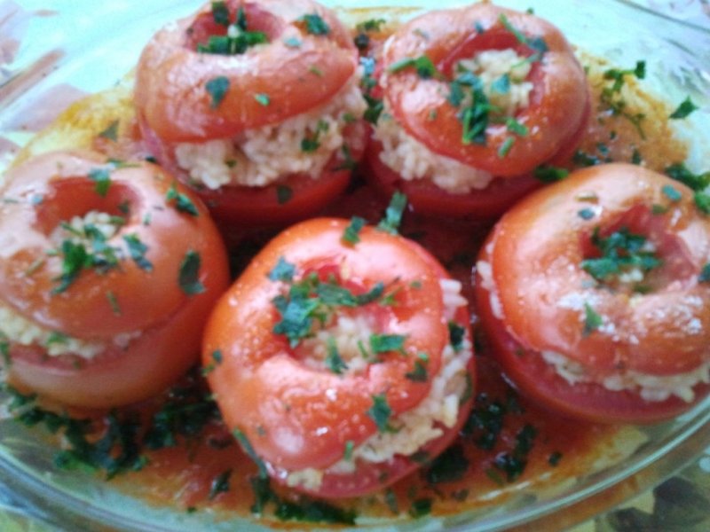 Toci miezul rosiilor si il pui la fiert cu putin zahar si un praf de sare. Torni sosul obtinut intr-o forma de sticla termorezistenta si asezi rosiile umplute. Presari peste rosii 1 lingurita de zahar si dai forma la cuptor pentru 30 de minute, la foc potrivit. Servesti rosiile cu patrunjel tocat presarat deasupra.