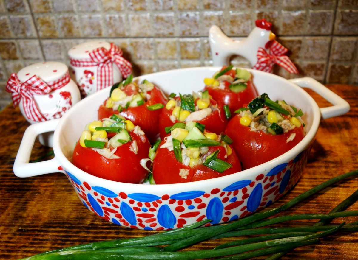 Intr-un bol punem castravetii, ceapa, porumbul dulce, bucatelele de macrou, bucatelele de rosii si sosul si amestecam. Cu amestecul obtinut umplem rosiile.