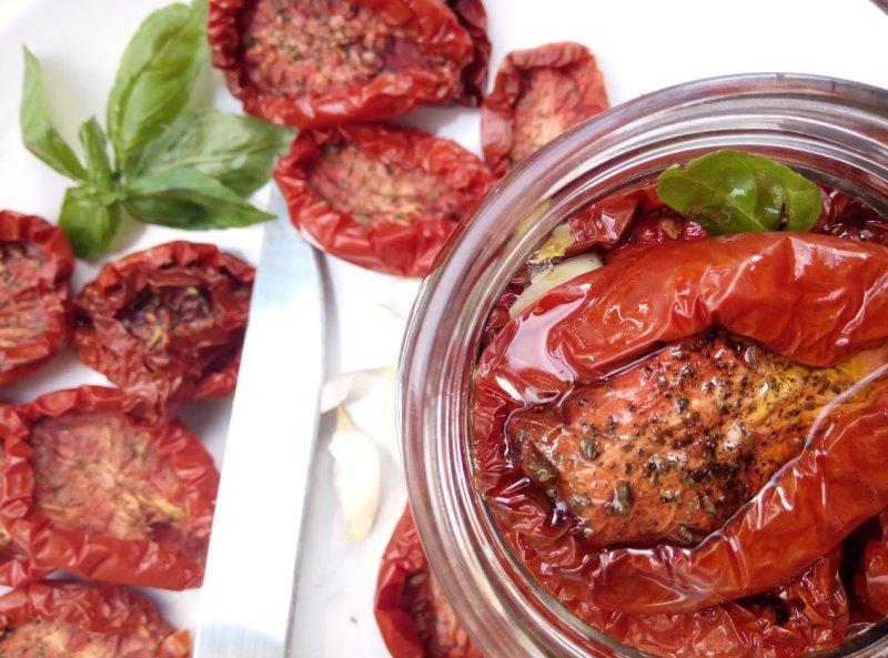 Cand rosiile si-au redus dimensiunea la aproape jumatate din cat erau la inceput, se iau si se pun una cate una intr-un borcan, amestecate cu usturoi proaspat si busuioc verde, iar deasupra se toarna uleiul de masline.