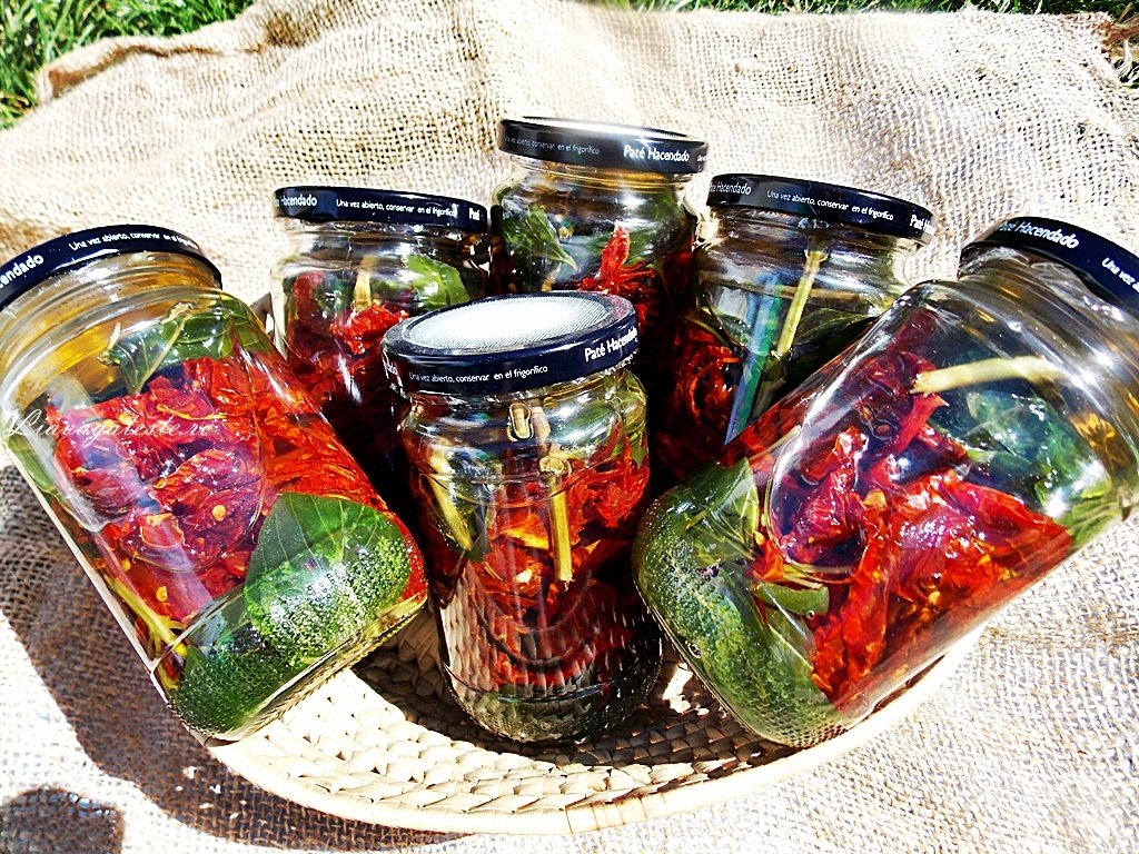 Punem pe fundul borcanului busuioc, apoi rosii coapte si la final acoperim din nou cu busuioc. Umplem borcanul cu ulei de masline si infiletam capacul. Etichetam si dam la camara,unde se pot pastra pana la patru luni. Dupa ce desfacem borcanul, il pastram la frigider, musai.