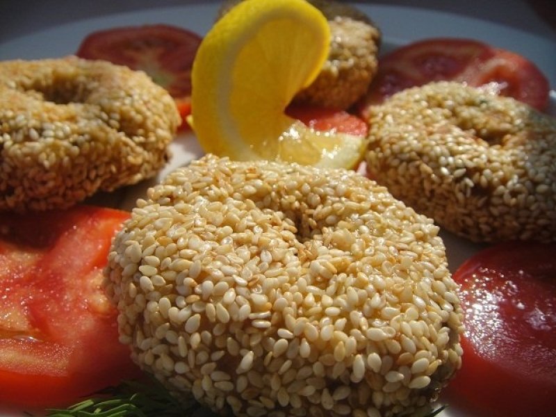 Ne umezim mainile si formam bilute pe care le strapungem cu degetul pe mijloc.Le tavalim prin susan si le rumenim in ulei incins.Pot fi servite calde sau reci ca aperitiv.