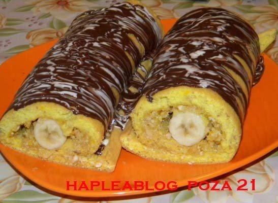 - scoatem aluatul din cuptor şi întindem peste el crema de cocos. Apoi punem bananele precum în poza 18. Rulăm cât este cald