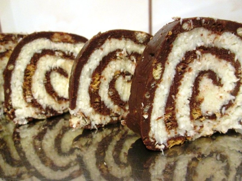 Frecam spuma untul cu zaharul pudra,adaugam nuca de cocos si vanilia.Intindem aceasta compozitie peste cea de biscuiti , apoi rulam cat mai bine cele 2 foi ajutandu-ne de folia de sub ele. Infasuram rulada in folie si introducem la rece pentru cateva ore.