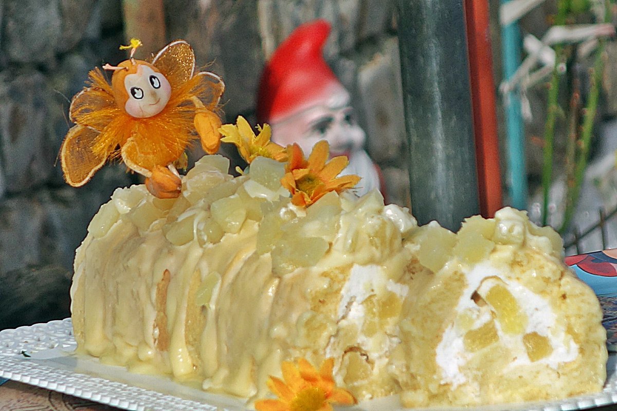 Se scoate folia cu piscoturi de la rece, se unge cu un strat de frisca, iar pe una din latura lunga a blatului se pune un rand de jeleu de ananas, apoi rulam strans cu folia si dam la rece 2 ore sau de preferat de seara pana dimineata.