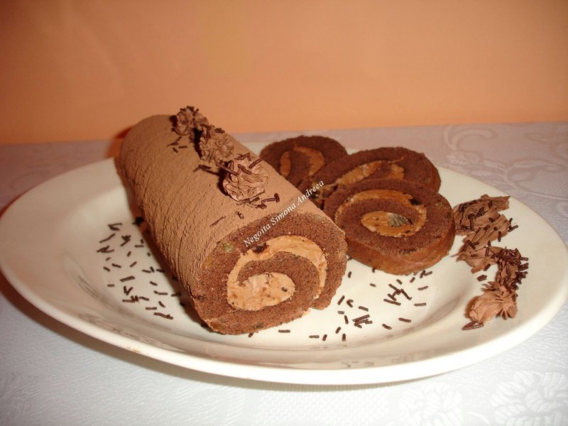 Se freaca untul spuma cu zaharul si esenta de rom. Se topeste ciocolata pe baie de aburi si se adauga la unt. Se amesteca bine. Blatul inca cald se rastoarna peste un prosop umed, se unge hartia de copt cu pensula inmuiata in apa rece pentru a se desprinde usor. Se scoate hartia dupa care se ruleaza cat e inca cald. Se lasa pana se raceste dupa care se umple cu crema si se ruleaza inapoi. Se pune in folie alimentara si se da la rece pentru cateva ore. Se orneaza dupa preferinta.