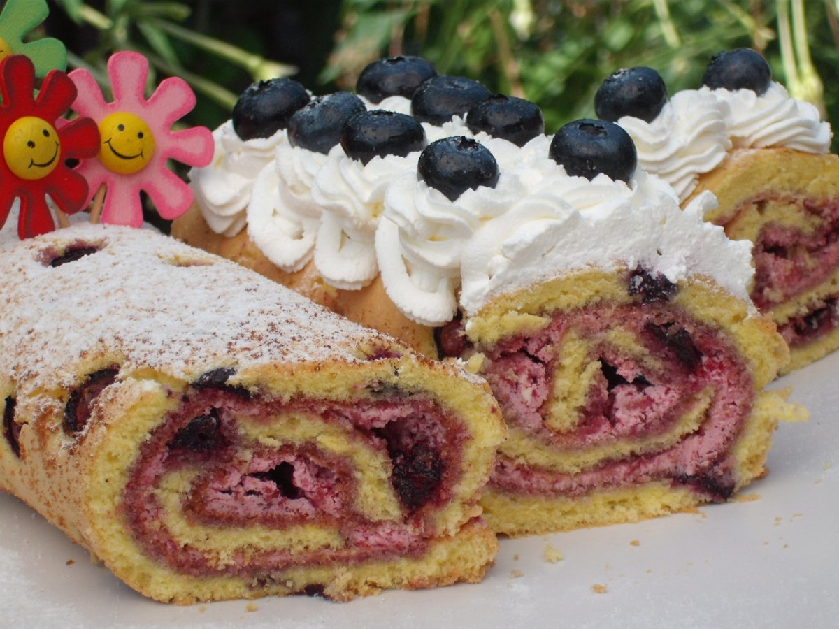 2.Se desprinde blatul de haria de copt cu lama unui cutit si se lasa sa se raceasca bine.Se intoarce blatul pe hartie cu dosul in sus apoi se unge cu untul frecat un pic si amestecat cu dulceata de afine,apoi se ruleaza strans ajutandu-ne de hartia pentru copt.Se pudreaza sau se decoreaza cu frisca si afine proaspete.Se da la rece timp de o ora apoi se taie in felii subtiri.