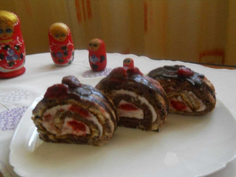 Acum urmeaza partea mai complicata, luati latura mai mica a ruladei si cu ambele maini incepeti sa rulati rapid, dar nu strans, altfel va iesi crema pe toate partile. Cand ati ajuns in partea opusa fixati hartia pe suprafata ruladei inclusiv pe capete, rulati intreaga rulada acum cu tot cu hartie, de data asta putin mai strans. Puteti sa o mai rulati cu inca o bucata de hartie si apoi o dati la frigider pentru cateva ore. Se orneaza cu restul de sos cu capsuni si cu sos de ciocolata (optional).