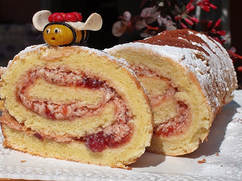 Dupa ce s-a racit, se intoarce blatul invers pe hartie si se unge cu gemul de capsuni frecat un pic cu untul sau margarina moale, la temperatura camerei. Se ruleaza strans, ajutandu-ne de hartia de copt, apoi se decoreaza cu zaharul pudra aromat cu vanilie si cacaua. Se da la rece o ora inante de a o felia.