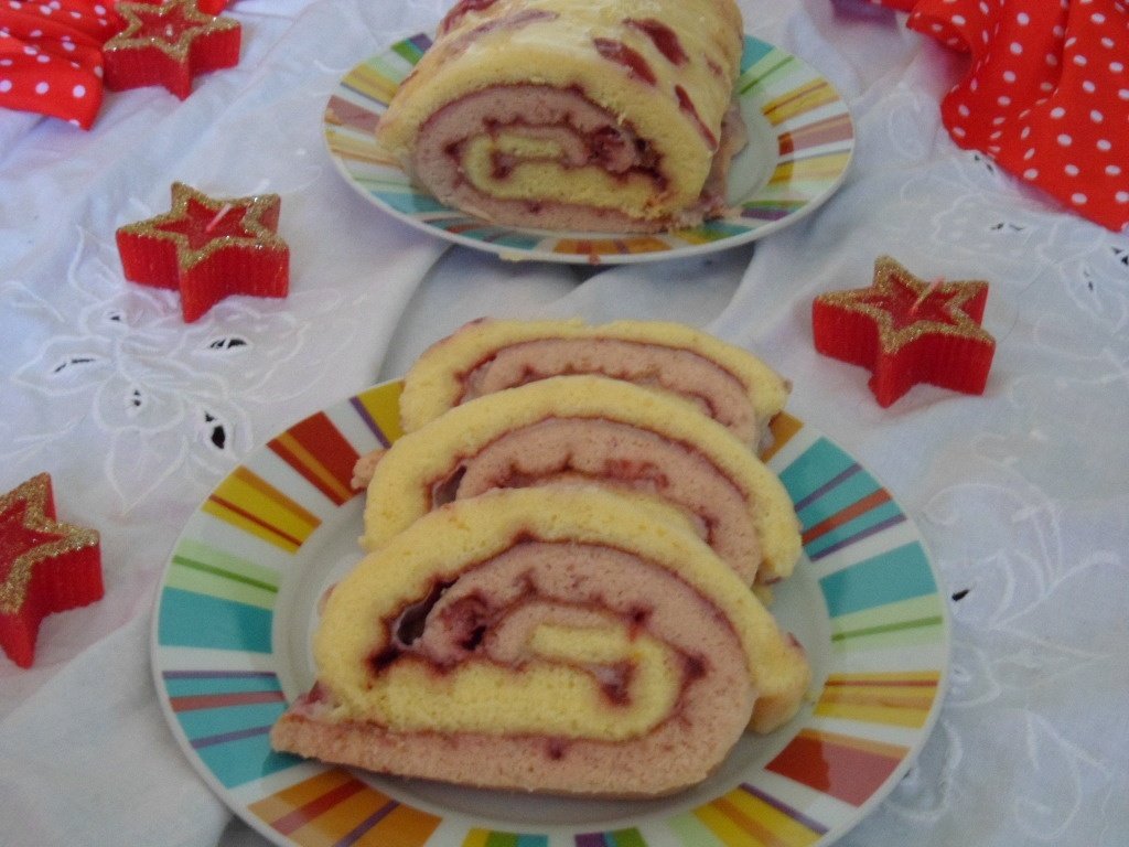 Crema de vanilie am facut-o conform instructiunilor de pe pachet, am pus 400 ml lapte, praful si am amestecat cu mixerul timp de 3 minute. Cand se racesc blaturile, le desfacem din prosop. Pe blatul alb punem un strat subtire de gem apoi un strat din crema de vanilie, peste punem blatul roz si punem la fel gem si crema de vanilie si apoi rulam. Deasupra ruladei am pus restul din crema de vanilie si gem de visine. Rulada se lasa la frigider 2 ore.