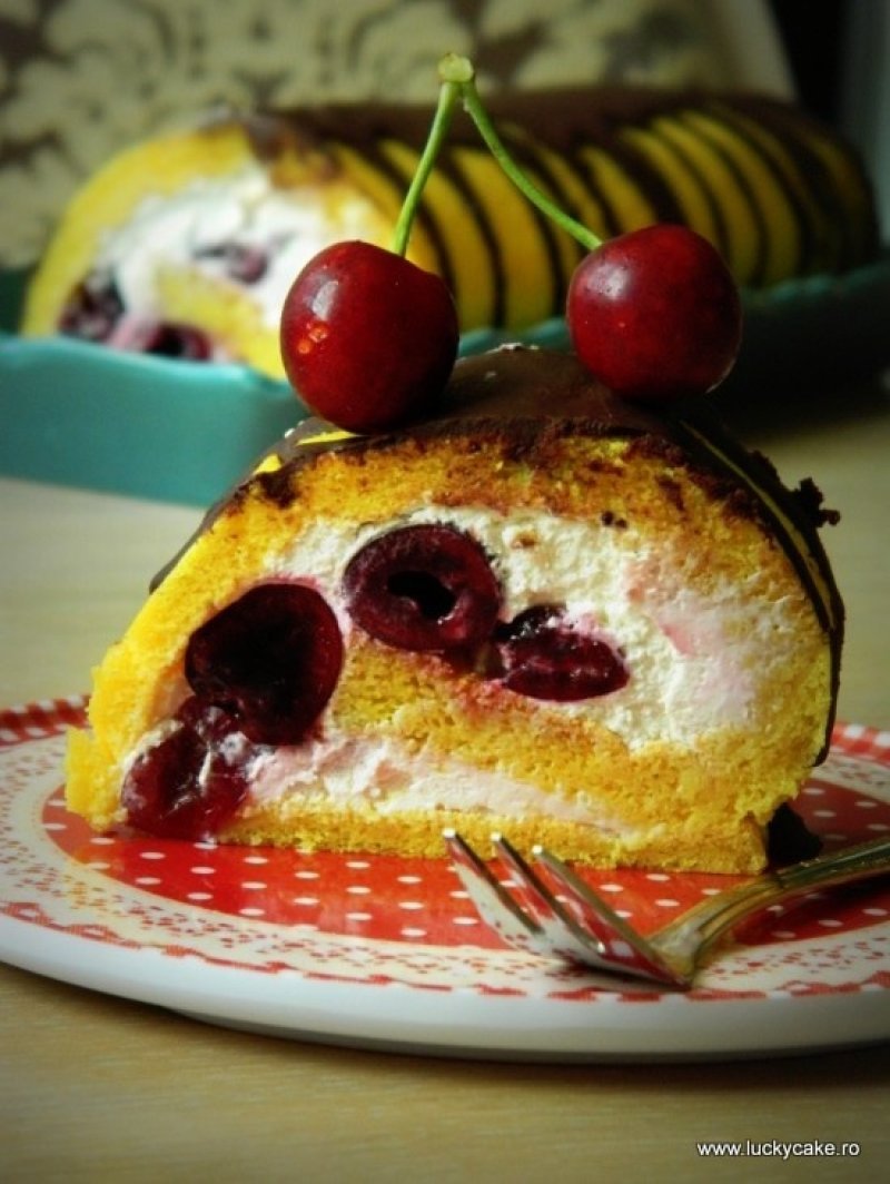 Indepartam prosopul si intindem blatul apoi nivelam crema si rulam din nou cu grija. Deasupra, decoram cu glazura de ciocolata ( topim ciocolata, adaugam laptele si amestecam bine ). Lasam rulada la rece o ora apoi e gata de servire