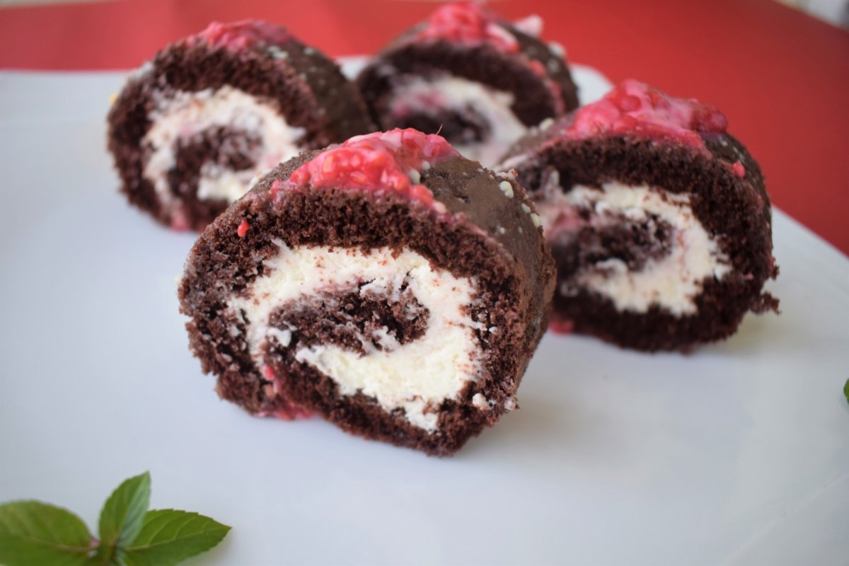 Blatul de rulada il desfacem si punem peste el un strat de zmeura. Blatul va absorbi excesul de sirop. Asezam mascarponele si intindem pe toata suprafata.