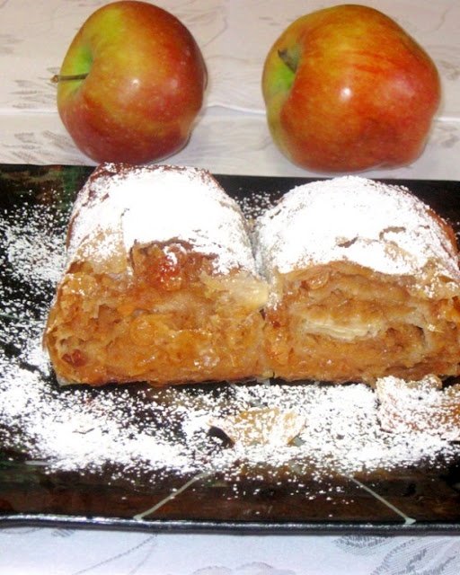 Intre timp se spala merele, se curata de coaja si seminte si apoi se dau prin razatoarea mare.Stoarcem bine ,prin presare intre palme, merele rase dupa care le amestecam cu zaharal . Le punem intr-o cratita la calit.Lasam pana cand scade tot sucul.lasat de acestea.Lasam sa se racoreasca si adaugam scortisoara , zaharul vanilat si stafidele bine scurse de apa.Amestecam bine cu ajutorul unei linguri de lemn.