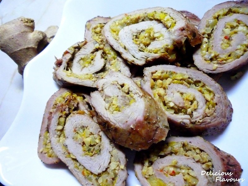 Curatam carnea de pielite si tendoane, o spalam si o stergem cu un servetel. Taiem muschiul pe lungime, dar nu pana jos, doar cat sa putem desface carnea sa fie o bucata mare. Acoperim cu o bucata de folie alimentara si o batem ca pentru snitel. Ungem cu putin ulei de masline, condimentam cu sare si piper si presaram cimbru. Punem carnea deoparte si pregatim umplutura. Tocam prazul marunt si o calim in putin ulei de masline. Adaugam ardeiul taiat cubulete mici si ciupercile feliate. Dupa 10 minute adaugam si ghimbirul dat prin razatoare, potrivim cu sare si piper. Intindem bucata de muschiulet, acoperim cu umplutura, rulam carnea, o prindem cu scobitoare, o infasuram intr-o bucata de folie, asezam intr-o tava si o dam la cuptorul preincalzit circa 45-50 minute minute, cu aproximativ 10 minute inainte de a fi scoase se despacheteaza si se mai lasa in cuptor pana se rumenesc.