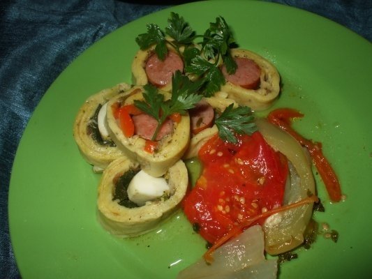 Curatati de coaja ouale fierte tari, taiati-le in sferturi si asezati-le intr-un rand pe lungime impreuna cu cabanosul. Incepeti sa rulati din partea unde este cabanosul si infasurati bine in folie. Celelalte 2 clatite le puteti umple cu spanac, ou, cabanos, le rulati in folie de aluminiu obtinand astfel doua rulade mai micute. (vezi video)