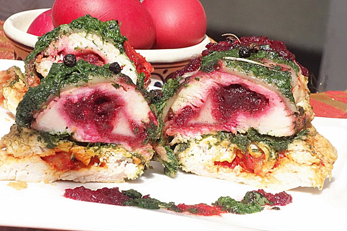 Se scoate pieptul afara, taiem si scoatem ata de bucatarie, indepartam scobitorile si punem deasupra, felii de cascaval, mai dam 5 minute la cuptor, sa se topeasca cascavalul pe piept, apoi scoatem si ungem deasupra cu cele 3 paste, in 3 fasii egale, presaram deasupra cateva fire de rozmarin uscat si cateva boabe de piper si mai lasam 5 minute.
