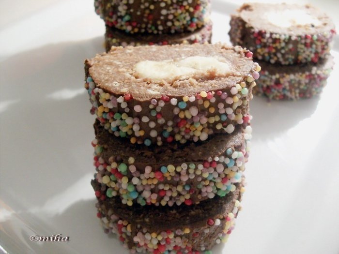 Am pus deasupra putina glazura de ciocolata si am presarat cu bombonele colorate. Am dat la frigider pana s-a intarit glazura.