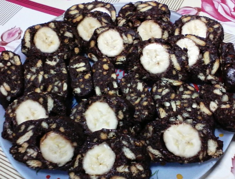 Topim untul/ margarina si luam de pe foc. Adaugam zaharul pudra, cacao si coniac si amestecam bine. Adaugam biscuiti faramati si nuci taiate marunt si amestecam. Lasam sa se raceasca. Pe o hartie de copt sau aluminiu adaugam rulada si rulam impreuna cu hartia (daca va place mai bogata puneti banana , cum am facut eu). Bagam la congelator 3-4 ore. Eu am lasat o in frigider.