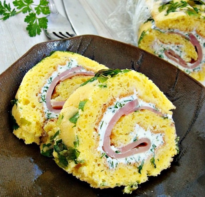 Se întinde amestecul de brânză în asa fel încât grosimea compoziției să fi e mai mică spre margini. Se întind apoi feliile de suncă si se rulează