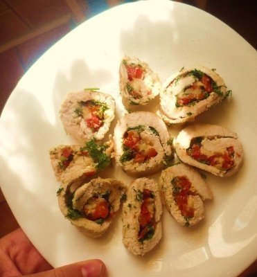 Se toaca marunt ardeiul gras rosu si verdeata. Se unge cu ulei de masline o folie de aluminiu, se aseaza cate o bucata de file de piept de puipeste care asezam in ordine verdeata tocata, ardeiul rosu calit (putin sa nu se duca culoarea) si apoi baghetele de cascaval.Se ruleaza , se da cu sare si piper si se prinde cu scobitori.Apoi s einveleste cu folia de aluminiu ca o bomboana si se da la cuptorul incins.Dupa 15 minute se desface folia si se mai lasa 5 minute in cuptor.Apoi se scot , se ung din nou cu ulei de masline si se tavalesc din nou prin verdeata tocata.Se taie rondele si se aseaza ca un caleidoscop.