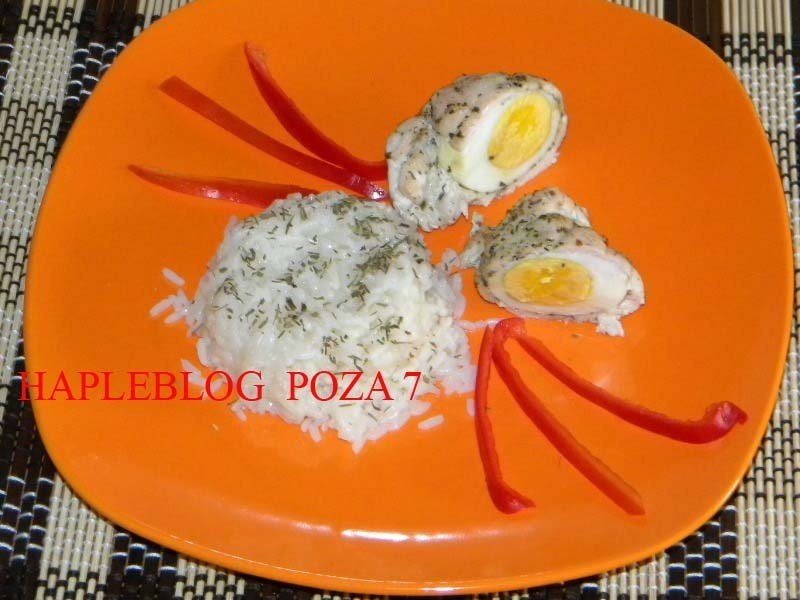 - se împăturesc ouăle curățate de coajă în pui și se leagă, ca să nu se desprindă rulada