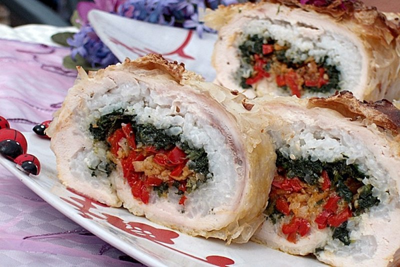 3.Se aseaza bucata de piept deasupra foilor de placinta apoi se uniformizeaza primul strat de orez,deasupra lui se vine cu al 2 lea strat de spanac cali si la urma se uniformizeaza stratul de ardei calit,se ruleaza usor cu tot cu foile de placinta .