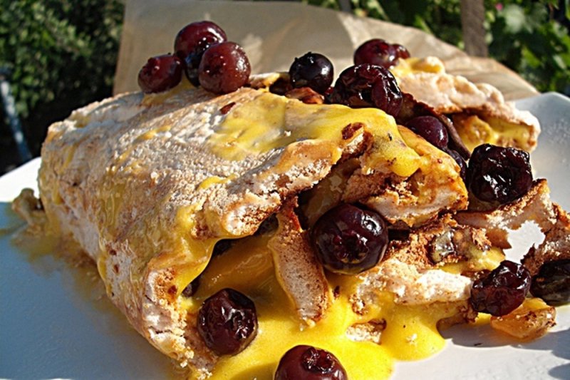 3.Se toarna crema rece peste blatul racit si el,de bezea ,se presara deasupra afinele alcoolizate si stafidele inmuite in putina apa fiarta,se ruleaza cu grija apoi se da la frigider ,cca 2 ore.Se taie cu un cutit ascutit,cu lama uda si se serveste foarte rece.