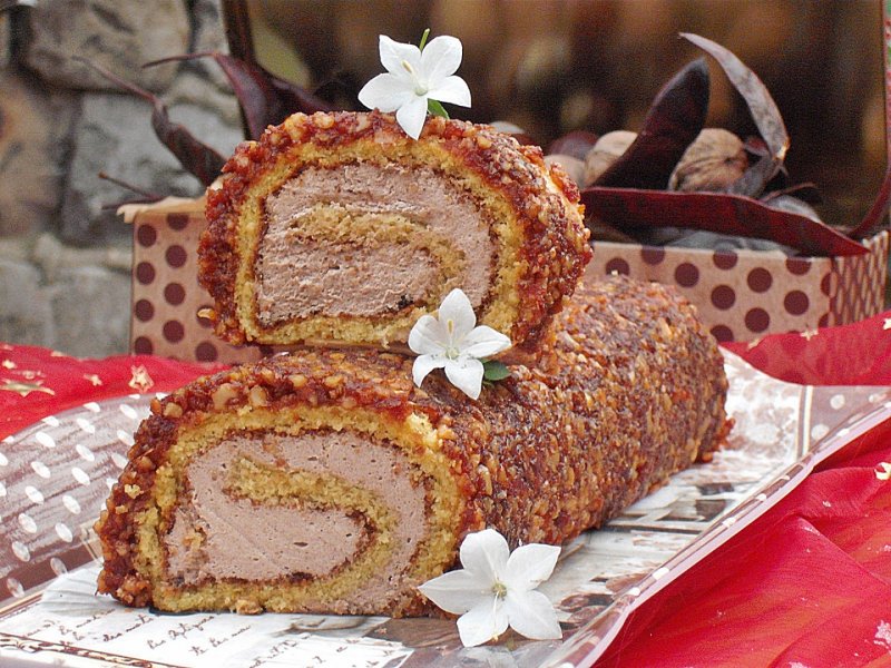 Se sparg alunele,se maruntesc fin.Se caramelizeaza zaharul apoi adaugam alunele,dam de pe foc si turnam in fir subtire ,amestecand continuu,oualele batute.Acoperim cu acest amestec de alune rulada si apoi mai lasam o ora la rece inante de a felia prajitura