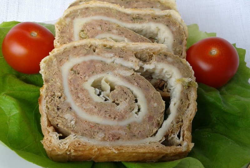 Se ia o foaie de aluat de foietaj (dupa ce s-a lasat la dezghetat la temperatura camerei) si se intinde pe masa infainata putin sau chiar direct pe foaia de copt, se acopera toata foaia cu jumatate din umplutura si se ruleaza strans, pe lungime. Cu grija, se asaza in tava, se unge cu ou si se presara seminte de susan. La fel se procedeaza cu cealalta foaie si restul de umplutura.