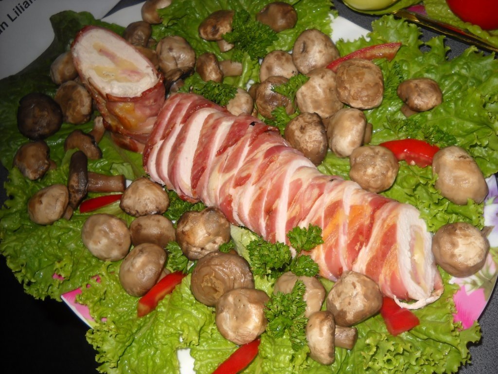 Se face un "pat" din feliile de bacon, se intinde deasupra pieptul de pui, batut usor intre doua folii alimentare, iar deasupra se aseaza cascavalul. Se ruleaza cu grija si se infig scobitori in fiecare feliuta de bacon pentru a nu se desface.Se introduce la cuptor.