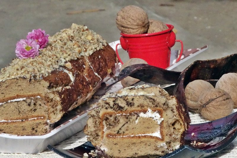 Se incorporeaza si albusurile batute spuma tare cu un praf de sare. La final se adauga cafeaua solubila si pudra de roscove si se amesteca superficial, apoi se toarna in tava tapetata cu hartie, se coace cca. 20 minute, apoi se desface cu lama unui cutit de pe hartie, se lasa sa se raceasca, apoi se intoarce cu partea coapta pe hartie, in sus. Aceasta se unge cu frisca batuta si intarita, apoi o rulam cu ajutorul hartiei si se lasa la rece de pe o zi pe alta. Se topesc cateva tablete de ciocolata alba, se intinde deasupra ruladei si se presara deasupra miez de nuca maruntit. Se mai lasa la frigider cca. 10 minute, apoi se poate felia.