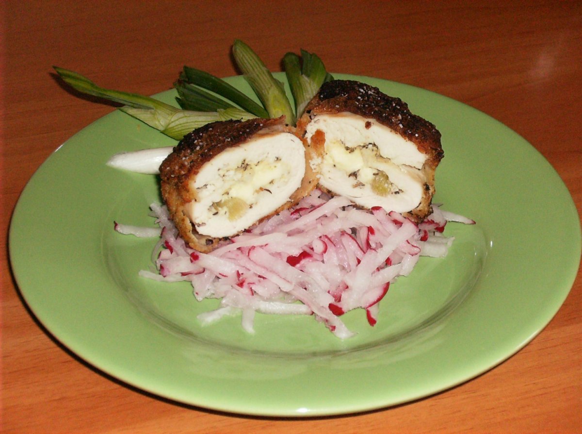 Spalăm și feliem pieptul de pui în 4 părți egale. Ștergem de apă feliile de piept de pui și le batem subțire. Sărăm, piperăm după gust și adăugam 1/2 din cantitatea de cimbru. Jumătate din felie ungem cu maioneză cealaltă jumătate cu muștar. Așezăm în mijlocul feliei bucățica de telemea și o bucată de ceapa verde(ceapă roșie).
