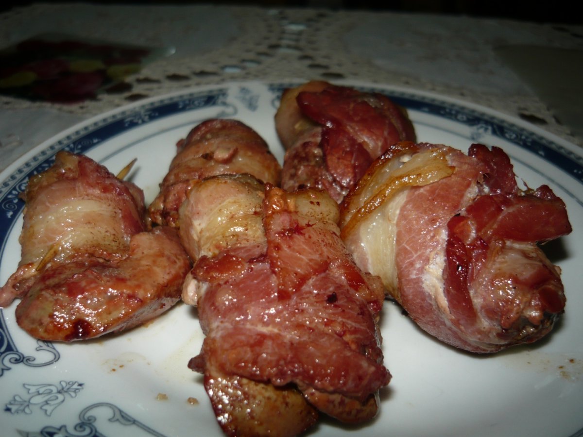 Ficat de pui folosim cat dorim, iar bacon- cate o felie pentru fiecare bucata de ficat. Ficatul se spala si se lasa sa se scurga bine de apa. Se presara cu sare si piper. Se taie apoi in bucati mai mici si se infasoara in felii de bacon. Se prind rulourile cu scobitori sa nu se desfaca. Se unge un vas de yena sau o tava cu o lingura de ulei si se asaza rulourile unul langa altul. Se presara cu sare, piper. Se introduc la cuptor pentru 20 min. Rulourile se servesc calde, cu piure de cartofi si salata. Sunt foarte bune si reci la picnic.