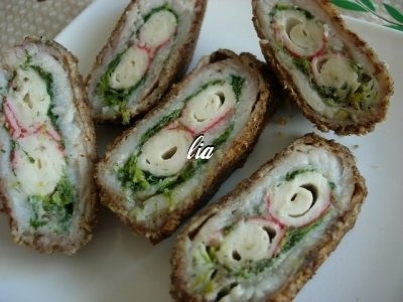 Luam cate o bucata de file, saram, piperam si cu ajutorul unei pensule, ungem putin cu ou,( partea interioara a fileului), presaram marar, apoi putin praz, asezam pe centru doua rulouri de surimi si inepem sa rulam cat mai strans. Pentru a nu se desface ruloul, ne ajutam de1-2 scobitori. Trecem rulourile prin faina, prin ou si la final prin nuca.