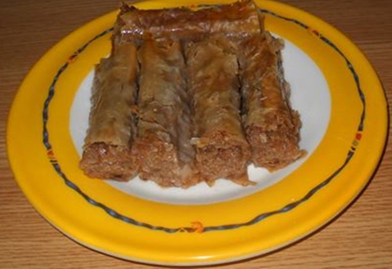Se presară pe fiecare dreptunghi 2-3 linguri de nuci și se rulează. Se așează rulourile in tavă, se toarnă uleiul peste ele insistând pe capete pentru a patrunde mai bine.