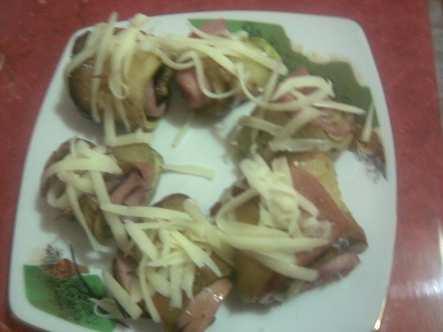 Din feliile de sunca taiem atatea fasii lunguiete, cate rulouri dorim, de asemenea taiem dovlecelul în felii, pe lungime (numarul feliilor sa corespunda cu cel al fasiilor de sunca).