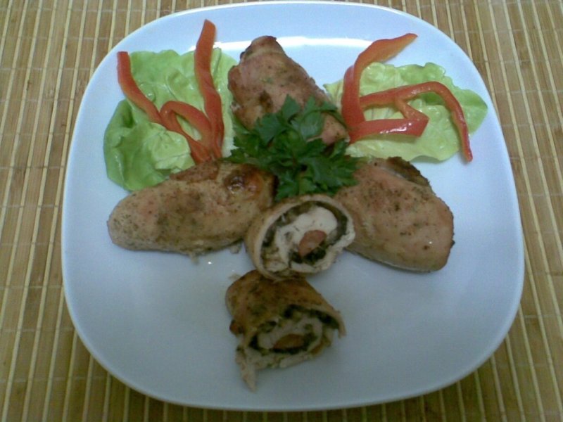 Apoi repartizam compozitia pe fiecare felie de piept de pui, punem o felie de mozzarella sau cascaval si o bucata de carnacior, rulam cu atentie si fixam cu o scobitoare. Asezam rulourile intr-o tava de yena, stropim cu putin ulei, condimentam cu sare si piper dupa gust, coriandru si oregano si adaugam vinul impereuna cu apa, acoperim cu folie de aluminiu si bagam tava la cuptorul preincins la 220 g C pentru 20-30 de minute, apoi scoatem folia si mai lasam la cuptor pentru 15-20 de minute pana se rumeneste frumos.