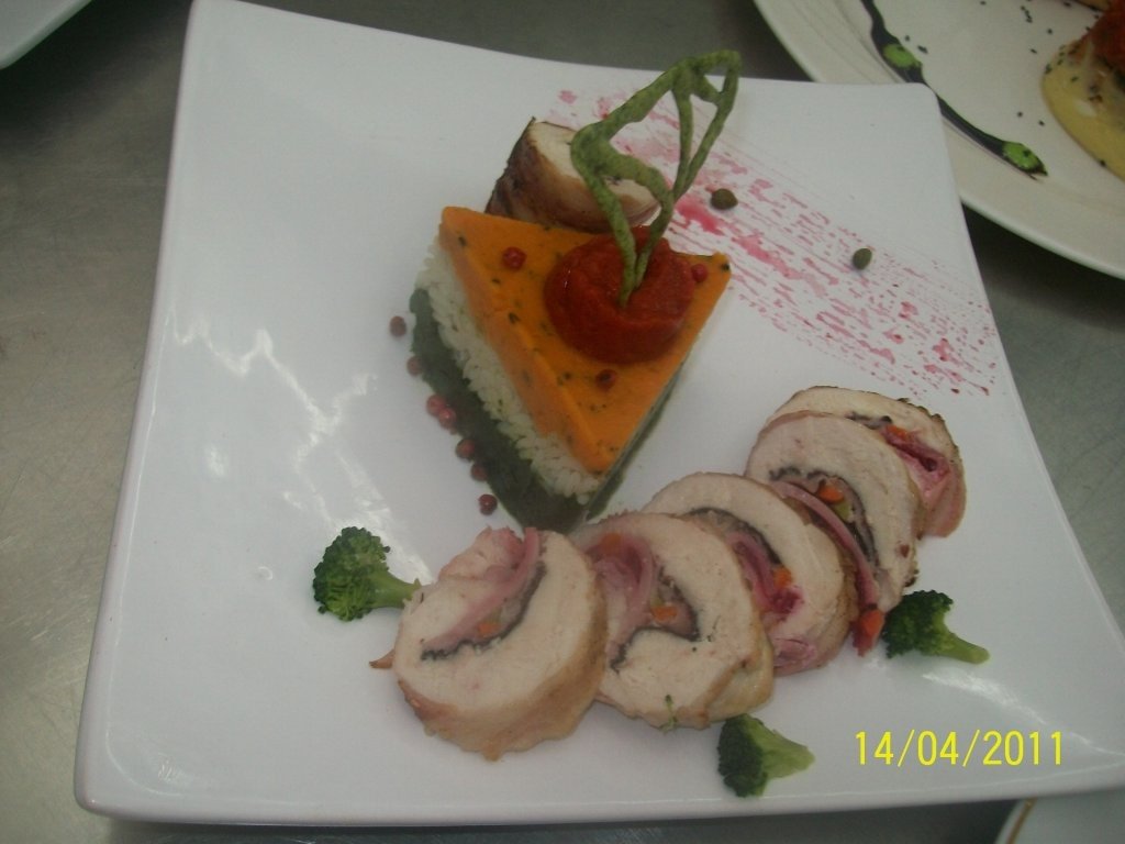 Trecem la montarea produsului pe farfurie dupa cum urmeaza, alegem o forma triunghiulara, in care asezam in straturi egale piureul de spanac, orezul, piureul de morcovi si deasupra punem o forma rotunda mai mica din plastic in care adaugam ultimul piure cel din ardei rosu si decoram cu un sticks cu spanac.