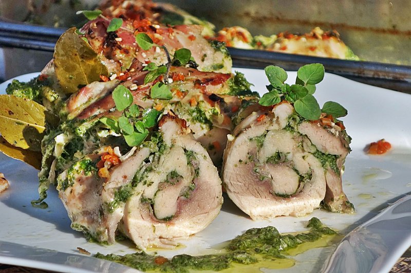 Peste fiecare pulpa cu prosciutto, asezam cu o lingura in strat subtire de patrunjel, apoi rulam strans si prindem capetele ruloului cu cate 2 scobitori. Se asaza rulou langa rulou intr-o tava, presaram un praf de sare, condimente, legumele deshidratate, turnam peste ele apa cu care am clatit paharul in care am preparat patrunjelul, fara sa acoperim rulourile, punem si frunzele de dafin, acoperim cu o folie de aluminu si dam la cuptorr cca. 20 minute, la foc mare; desfacem folia si mai lasam sa se rumeneasca rulourile cca 15-20 minute, la foc potrivit. Se servesc calde,stropite cu sos din tava.