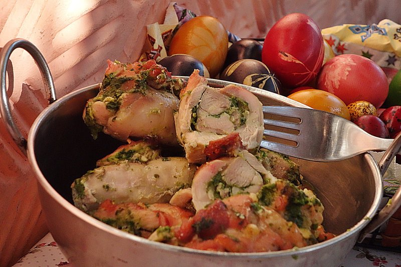 Pe fiecare bucata de pulpa, se intinde un strat de verdeata blenduita, se ruleaza usor si se prind la catete cu scobitori. Fiecare rulou se asaza unul langa altul, intr-o tavita ingusta si inalta (gen cozonac), se stropesc deasupra cu un pic de ulei, se toarna vinul roze, se completeaza cu apa rece, pana aproape sa acopere rulourile, se presara un praf de sare, piper, felii de usturoi, foile de dafin, o lingurita din amestecul de verdeata si se da la cuptor, cca. 30 minute, sa se rumeneasca frumos.